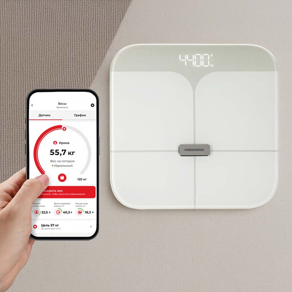 Напольные весы РЕДМОНД SB1812S в сером цвете с лаконичным дизайном и платформой из закаленного стекла позволяют определить вес с точностью до 50 г в диапазоне от 0,1 до 180 килограммов. В приложении Ready for Sky REDMOND сохраняются данные о 18 параметрах измерения тела, в том числе о мышечной и жировой массе, скорости метаболизма и норме веса.